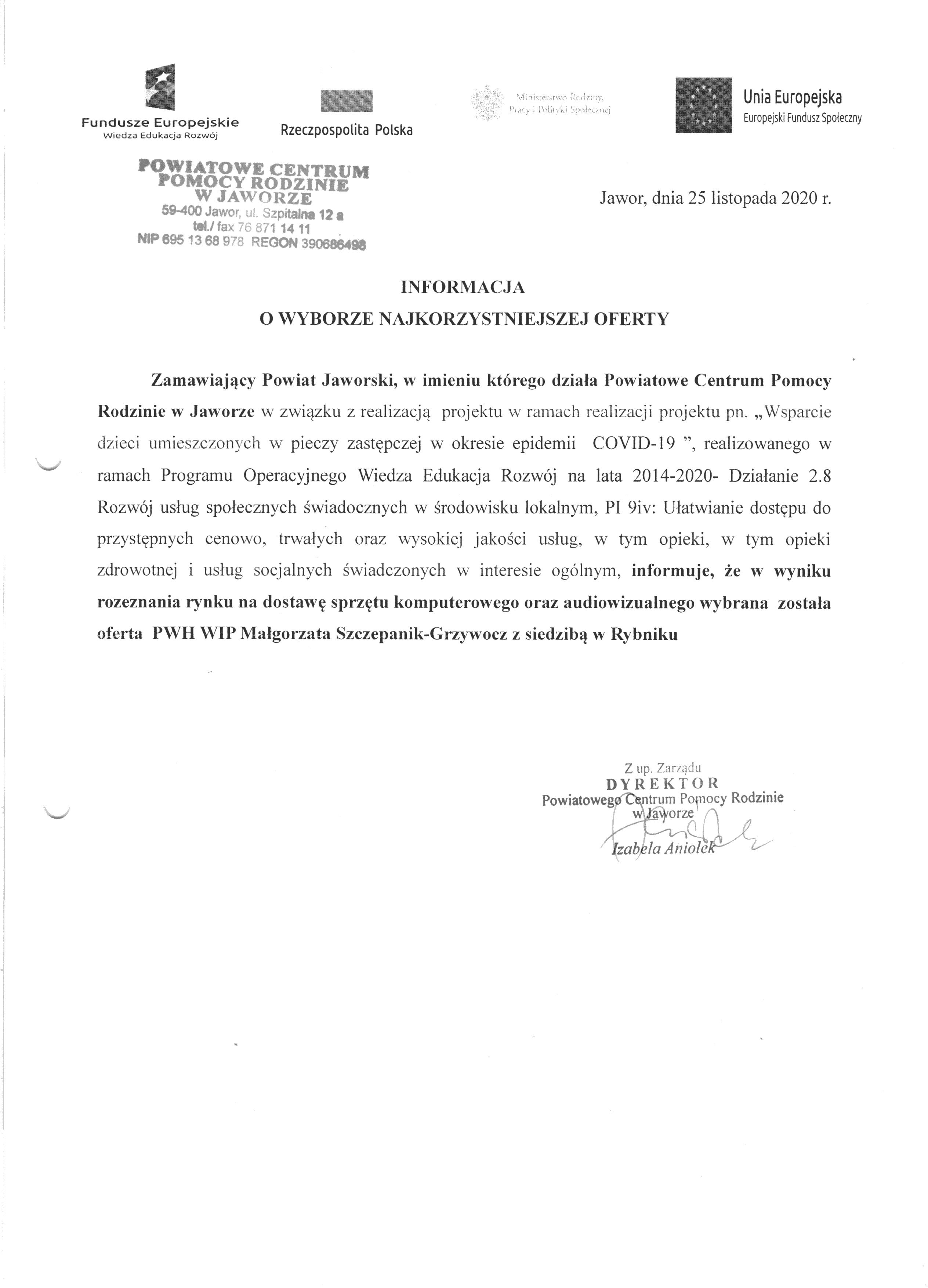 Informacja o wyborze najkorzystniejszej oferty na dostawę sprzętu komputerowego, osprzętowienia (myszy, słuchawki, kamerki), projektorów, telewizorów w ramach projektu pn. \\\\