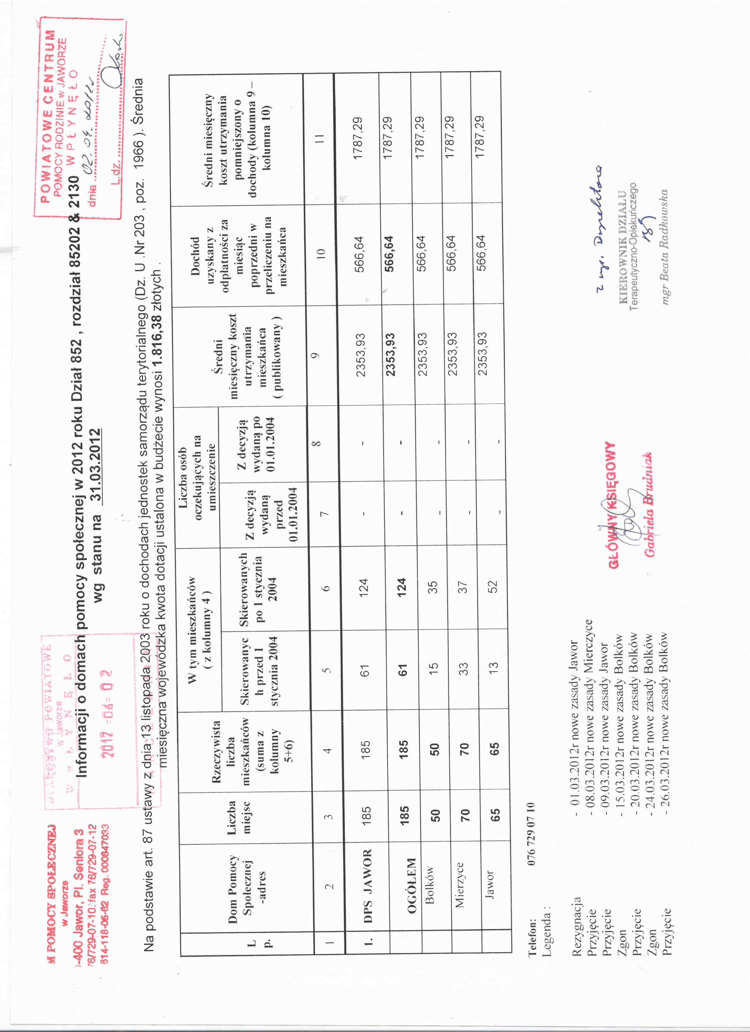Informacja o liczbie mieszkańców DPS w Jaworze 2012 r.